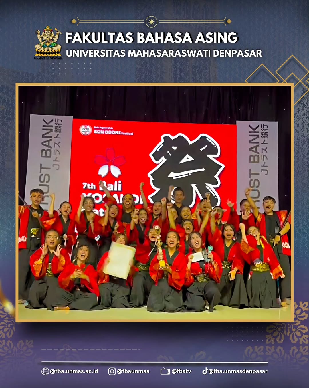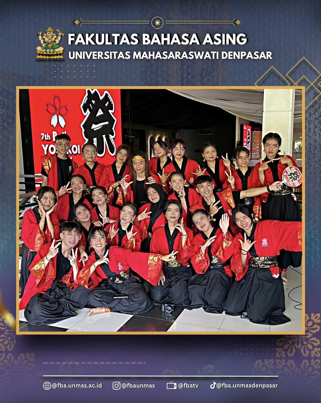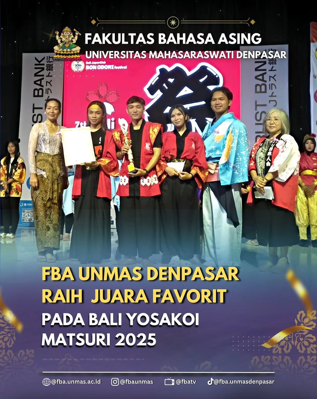 Dalam kompetisi yang diikuti berbagai tim dari seluruh Bali, penampilan Tim FBA Unmas Denpasar berhasil mencuri perhatian para juri dan penonton. Dengan mengusung koreografi yang memadukan unsur budaya lokal dan Jepang, tim tampil penuh kreativitas, kekompakan, dan semangat, sehingga layak menyandang gelar Juara Favorit Yosakoi 2025.