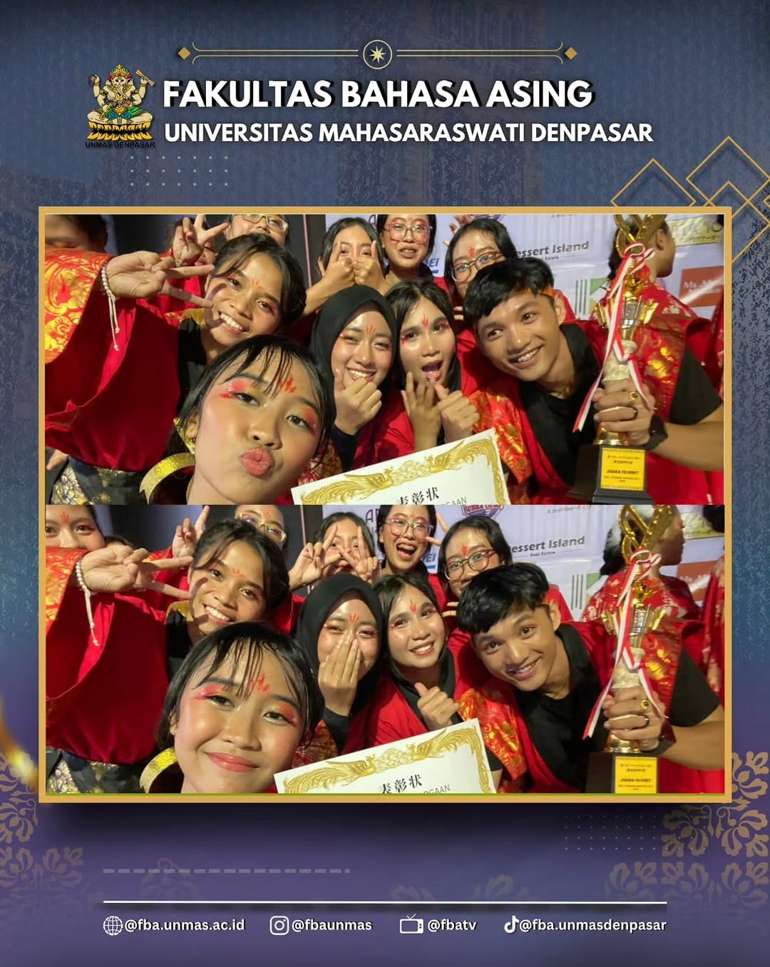 Prestasi ini tidak hanya menunjukkan kualitas mahasiswa FBA di bidang seni dan budaya, tetapi juga membuktikan komitmen mereka dalam menjembatani kolaborasi budaya lintas negara. Hal ini sejalan dengan visi internasionalisasi kampus dan semangat pelestarian budaya melalui generasi muda.