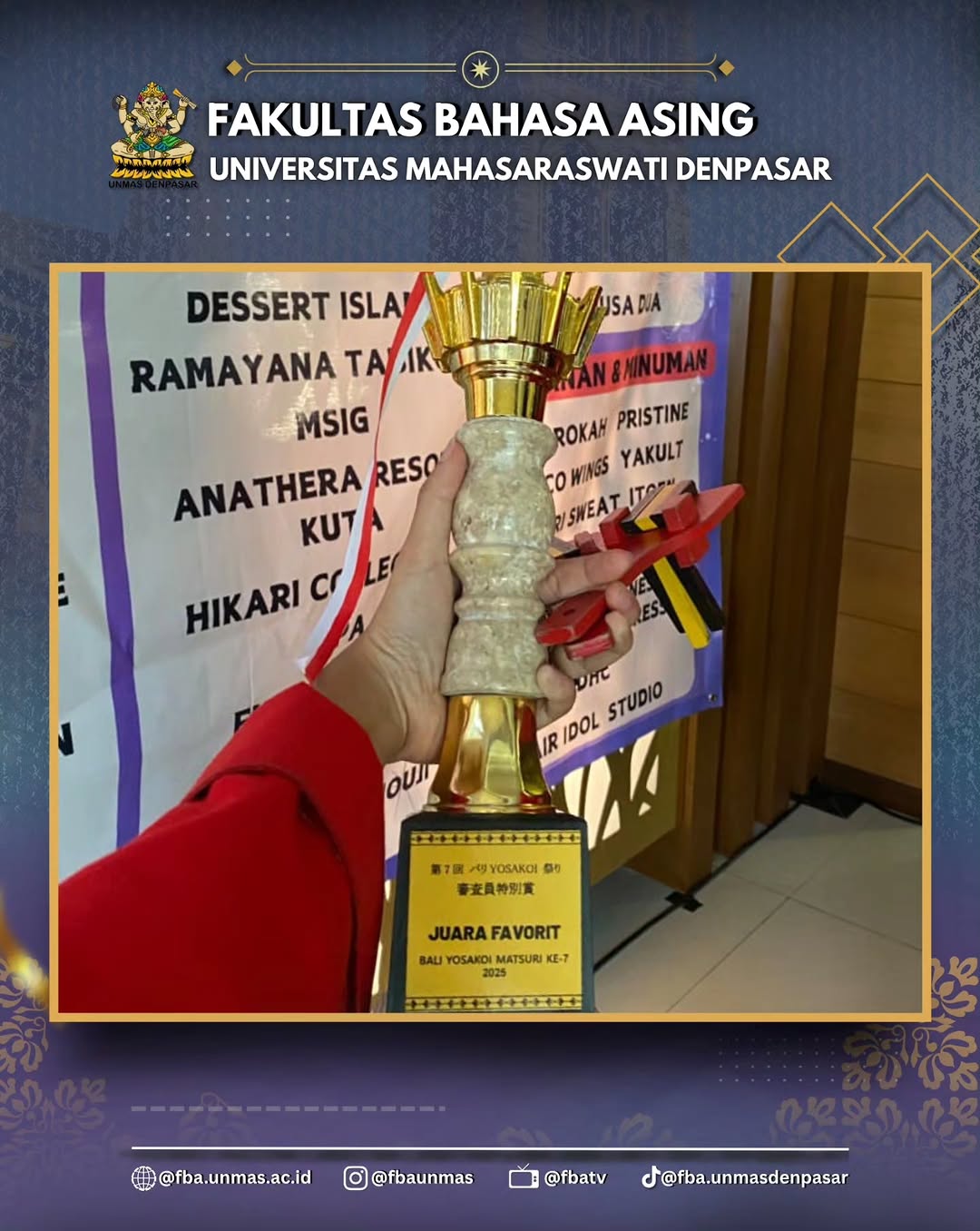 Denpasar, 4 Oktober 2025 – Fakultas Bahasa Asing (FBA) Universitas Mahasaraswati Denpasar kembali menorehkan prestasi gemilang dalam ajang internasional. Tim FBA berhasil meraih Juara Favorit dalam Bali Yosakoi Matsuri ke-7, sebuah festival tahunan budaya Jepang yang diadakan oleh Yayasan Persahabatan Jepang Bali, bekerja sama dengan Konsulat Jenderal Jepang di Denpasar.