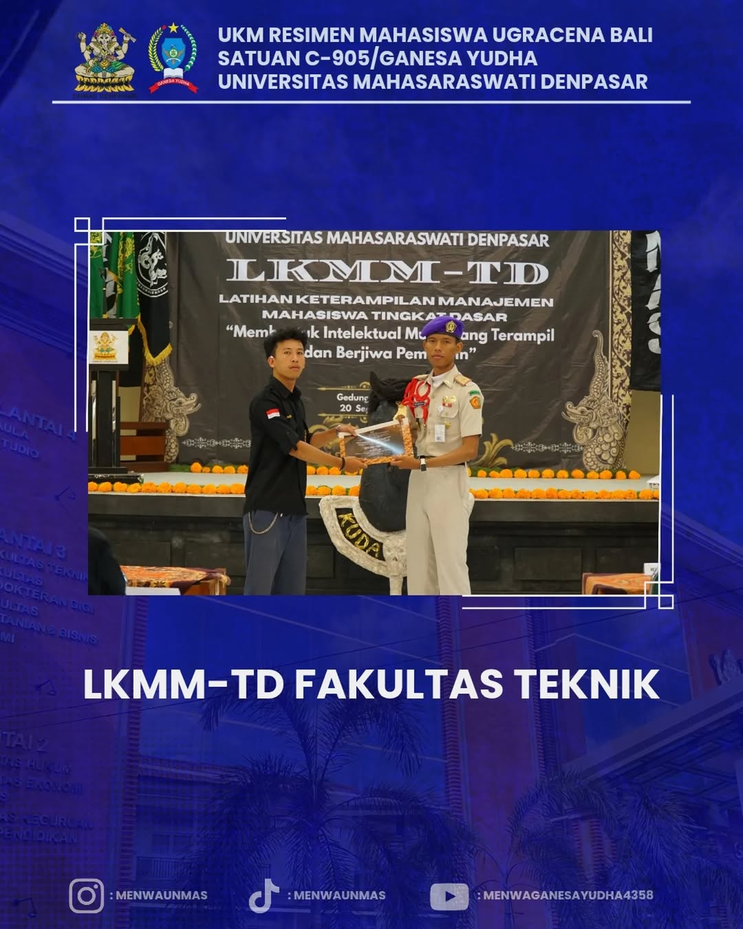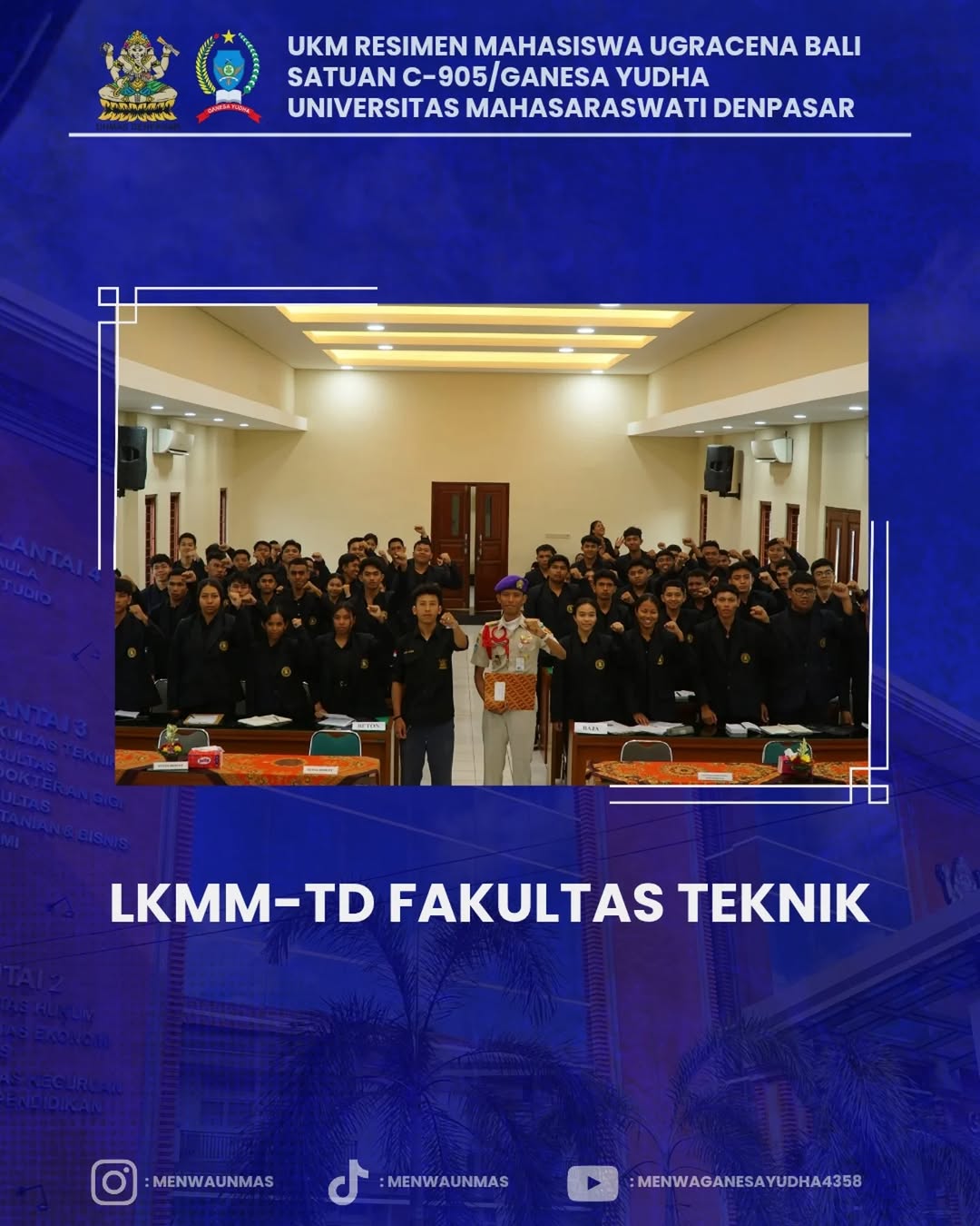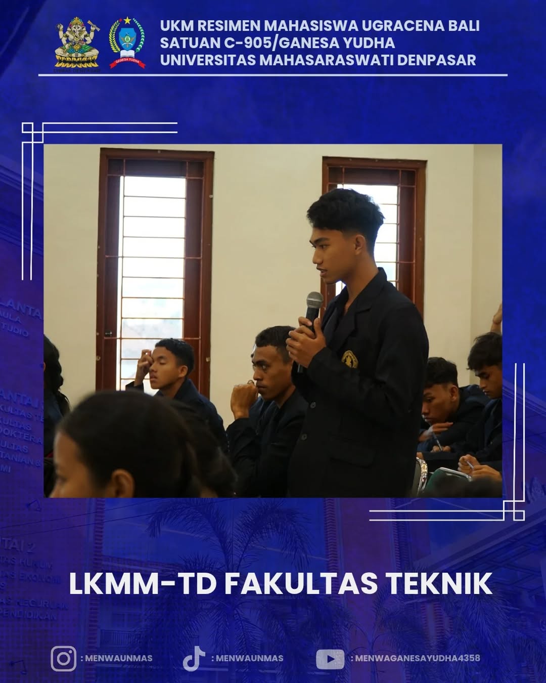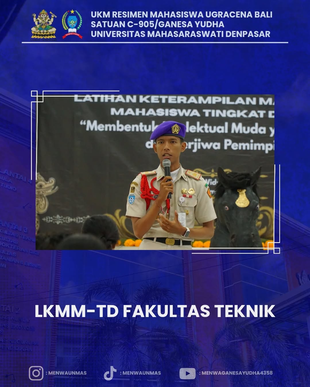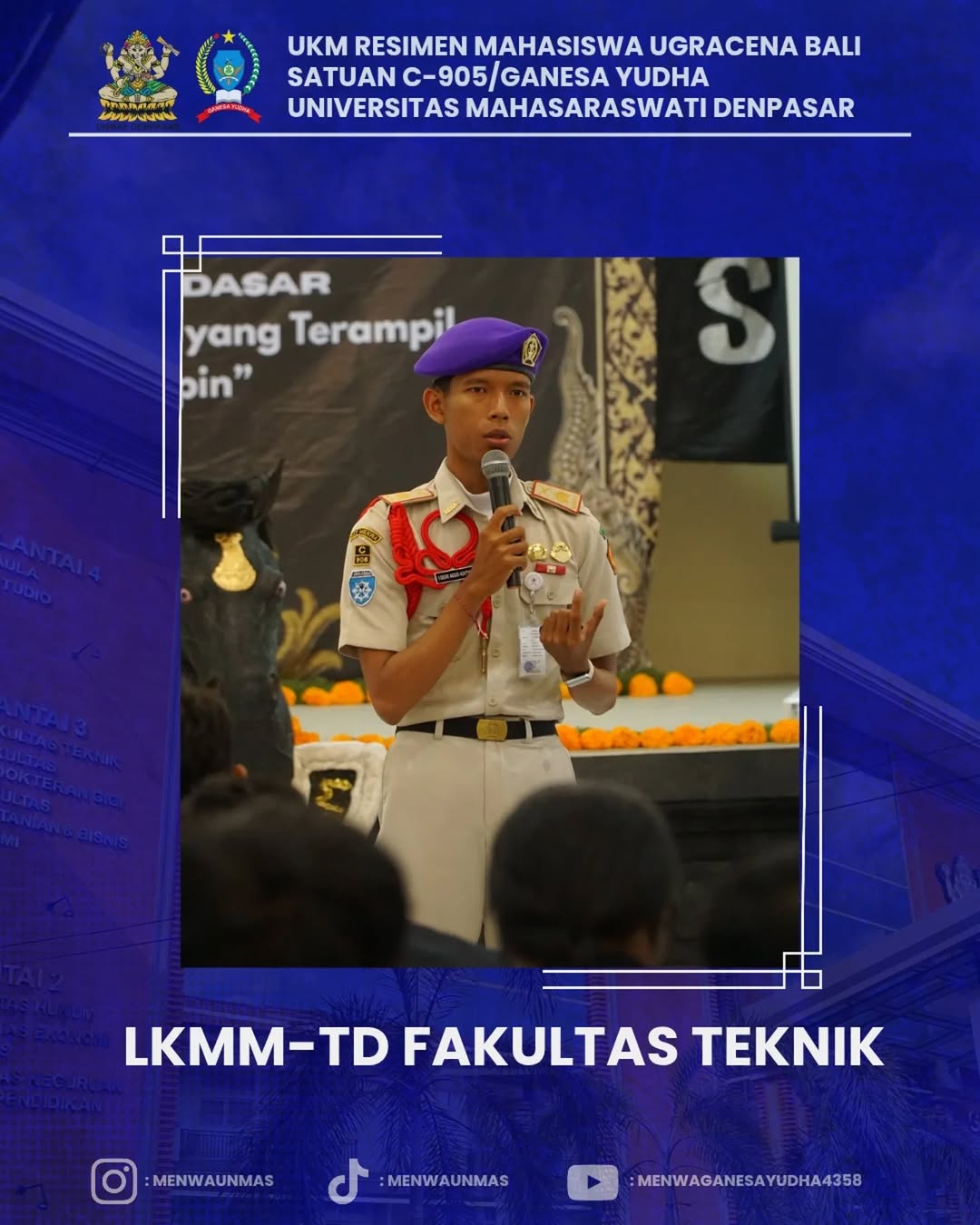 Denpasar, 20 September 2025 — Dalam rangka mendukung pengembangan kapasitas kepemimpinan mahasiswa, Resimen Mahasiswa (Menwa) Satuan C-905/Ganesa Yudha Universitas Mahasaraswati Denpasar turut berkontribusi dalam kegiatan Latihan Kepemimpinan Manajemen Mahasiswa Tingkat Dasar (LKMM-TD) yang diselenggarakan oleh Fakultas Teknik Unmas Denpasar.
