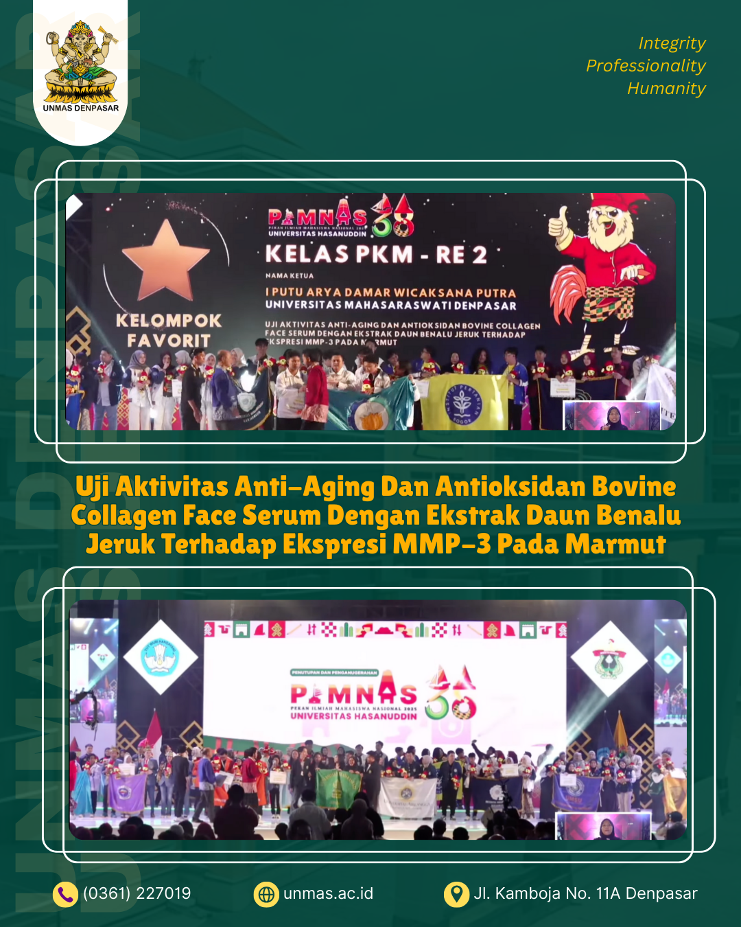 ​#UnmasDenpasar #UniversitasMahasaraswatiDenpasar #PIMNAS38 #JuaraPIMNAS #PKM #RisetEksakta #PrestasiMahasiswa #KampusMerdeka #MahasiswaBerprestasi #BanggaUnmas #UnmasJaya