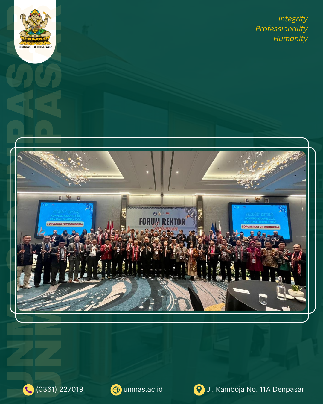 Kehadiran Rektor Unmas Denpasar dalam forum berskala nasional ini menunjukkan komitmen universitas terhadap penguatan ekosistem pendidikan tinggi dan penyesuaian diri terhadap tuntutan perubahan global. Melalui momentum ini, Unmas Denpasar menegaskan kesiapannya mengembangkan kampus yang lebih relevan, inovatif, dan berdampak sesuai arah pembangunan pendidikan tinggi Indonesia yang menekankan transformasi digital, penguatan riset, kolaborasi lintas sektor, dan kontribusi nyata bagi masyarakat. Forum ini sekaligus membuka peluang bagi Unmas Denpasar untuk memperluas jejaring, memperkuat sinergi, serta berpartisipasi dalam perumusan kebijakan strategis yang akan menentukan masa depan pendidikan tinggi Indonesia.
